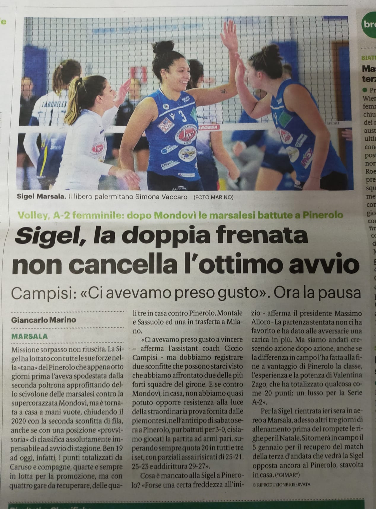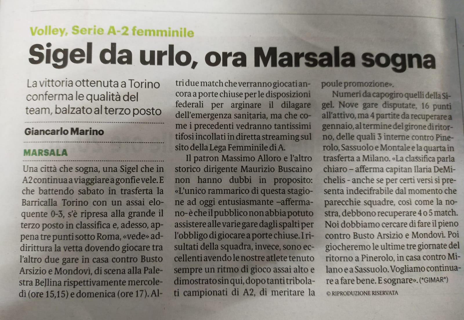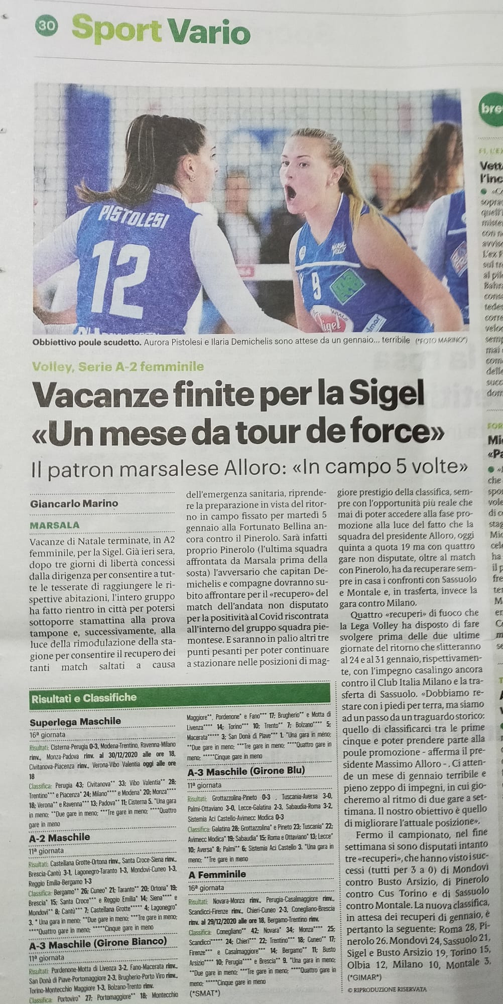 Il Giornale di Sicilia, in edicola ieri, illustra i prossimi appuntamenti che attendono la Sigel Marsala tra recuperi e partite precedentemente calendarizzate. All’interno del pezzo è riportato il commento del presidente Massimo Alloro interpellato riguardo al prosieguo di stagione. L’articolo giornalistico porta la firma di Giancarlo Marino. La foto copertina ritrae a sinistra Aurora Pistolesi, […]