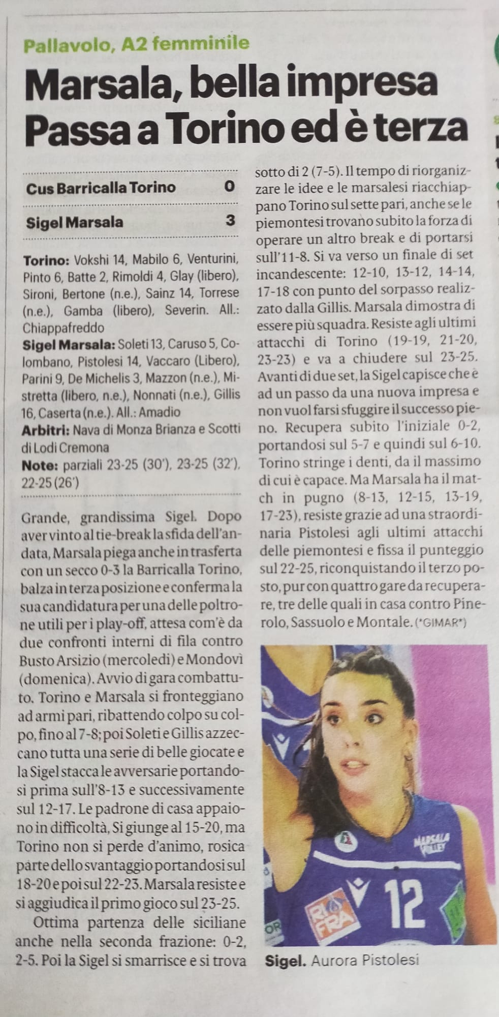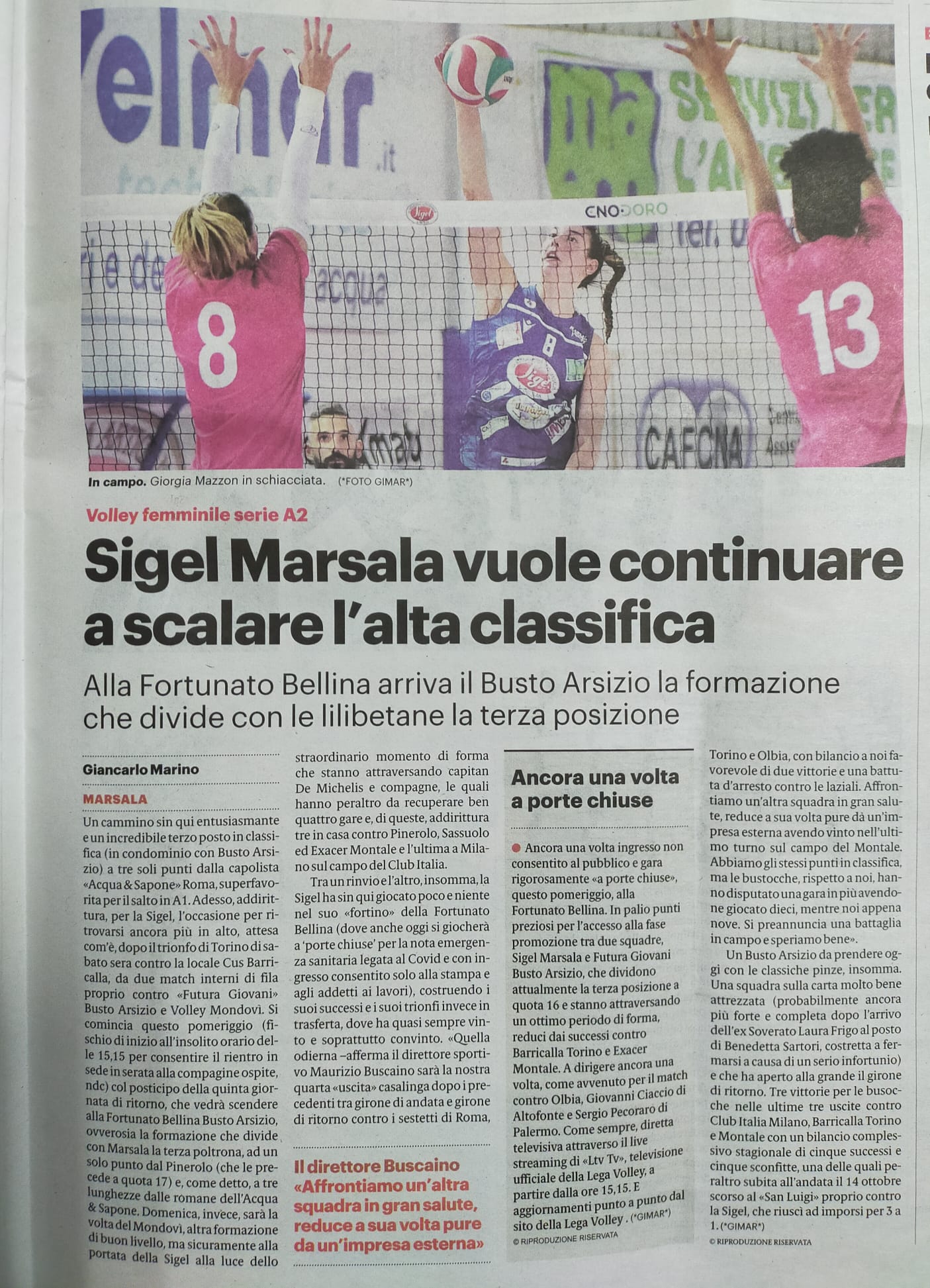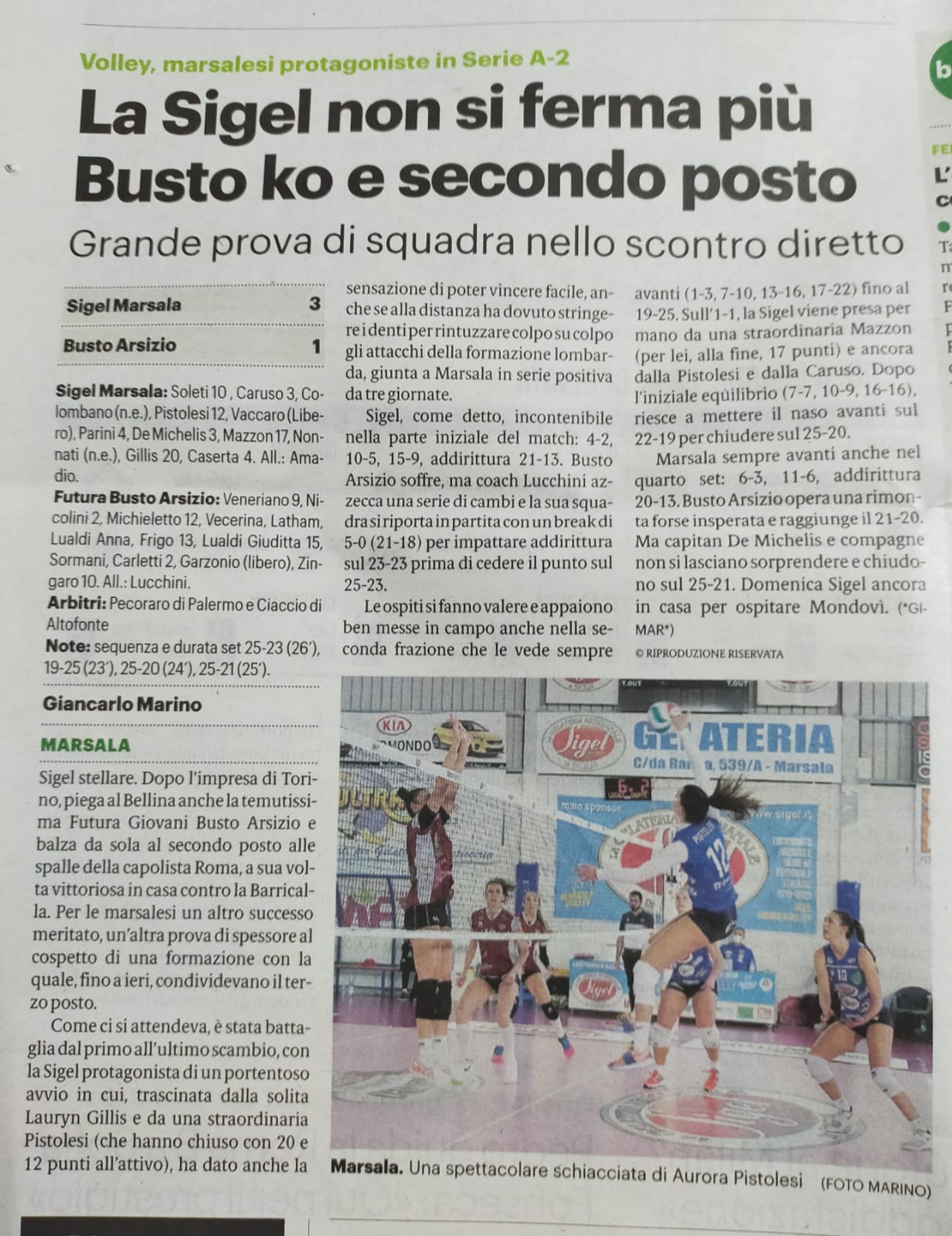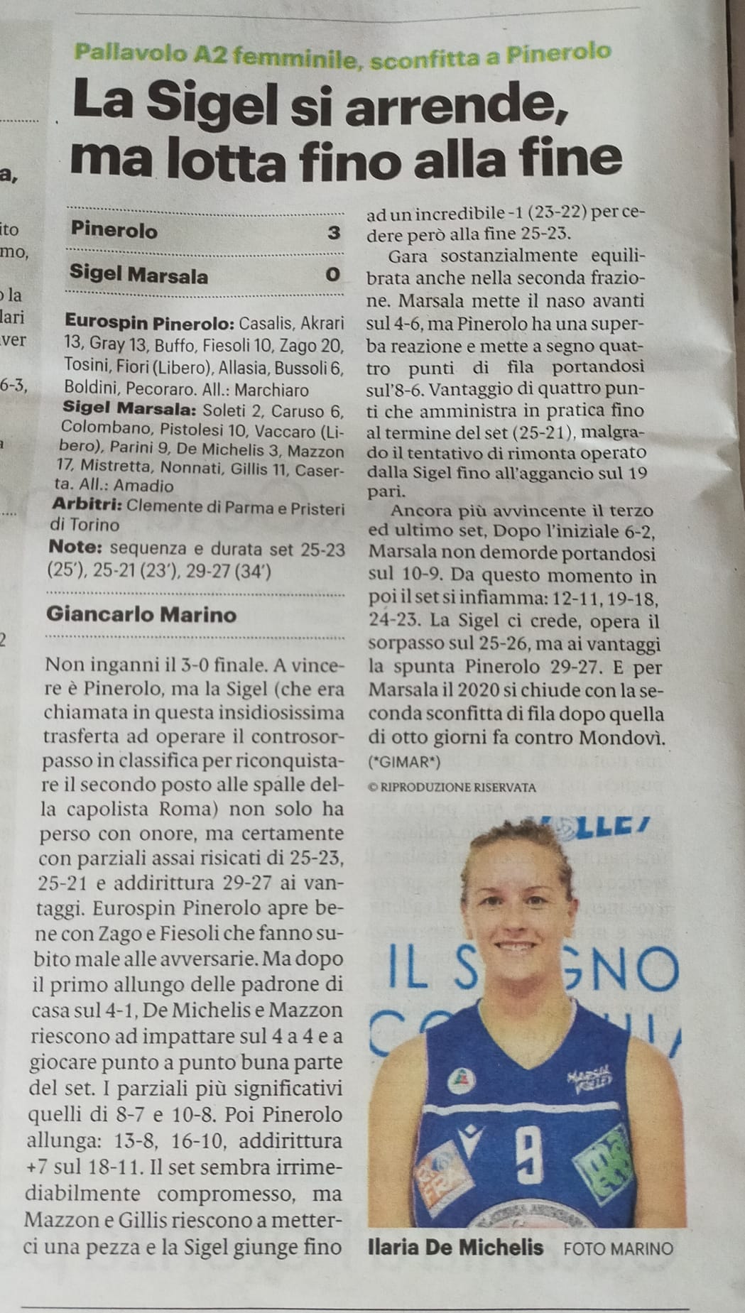 Il Giornale di Sicilia, in edicola ieri, illustra i prossimi appuntamenti che attendono la Sigel Marsala tra recuperi e partite precedentemente calendarizzate. All’interno del pezzo è riportato il commento del presidente Massimo Alloro interpellato riguardo al prosieguo di stagione. L’articolo giornalistico porta la firma di Giancarlo Marino. La foto copertina ritrae a sinistra Aurora Pistolesi, […]