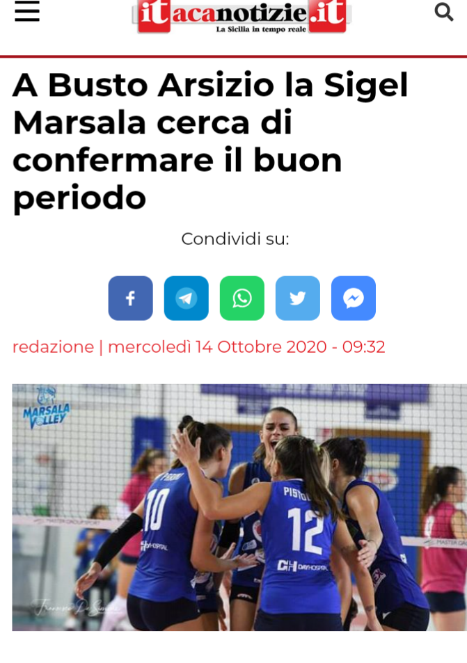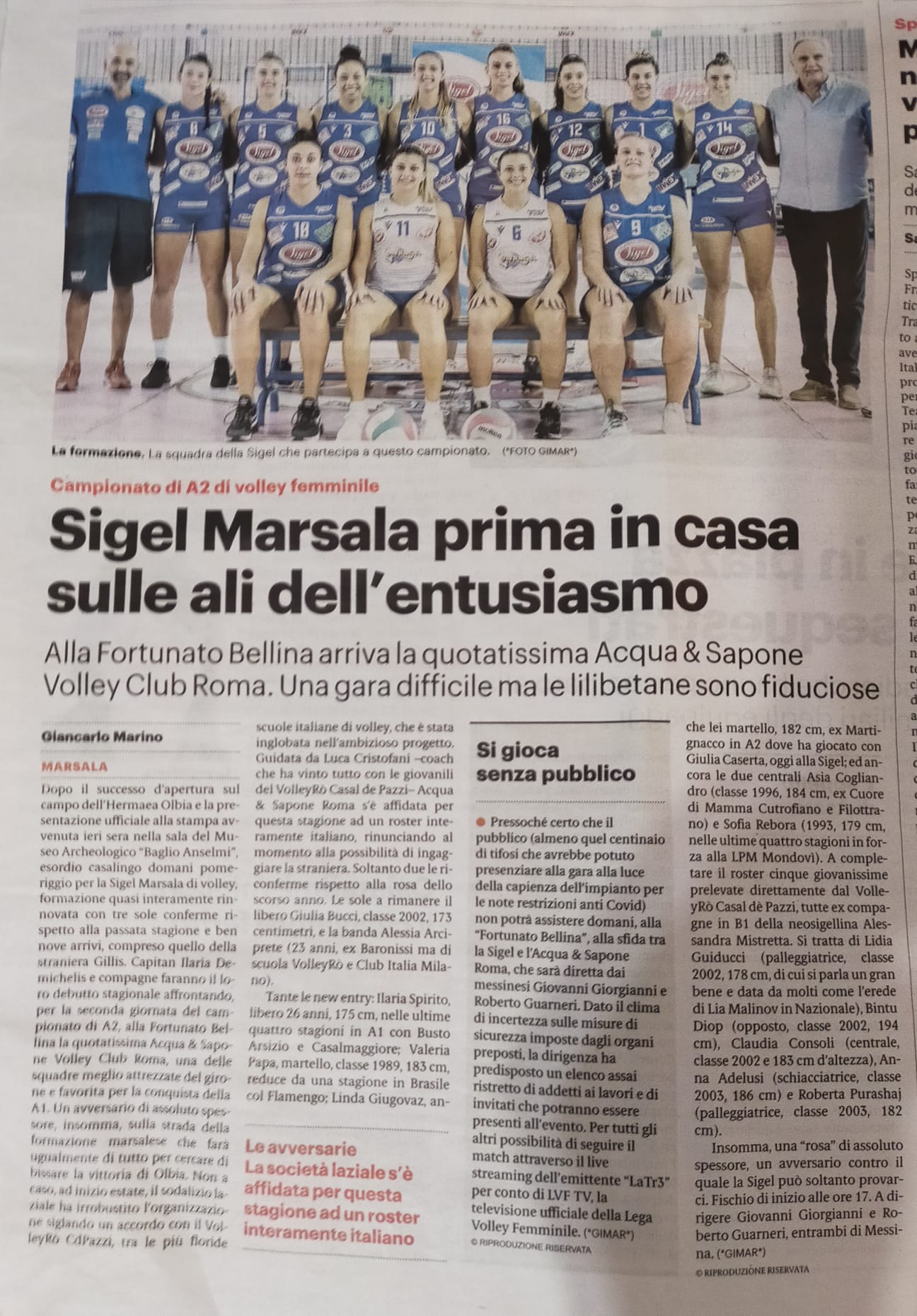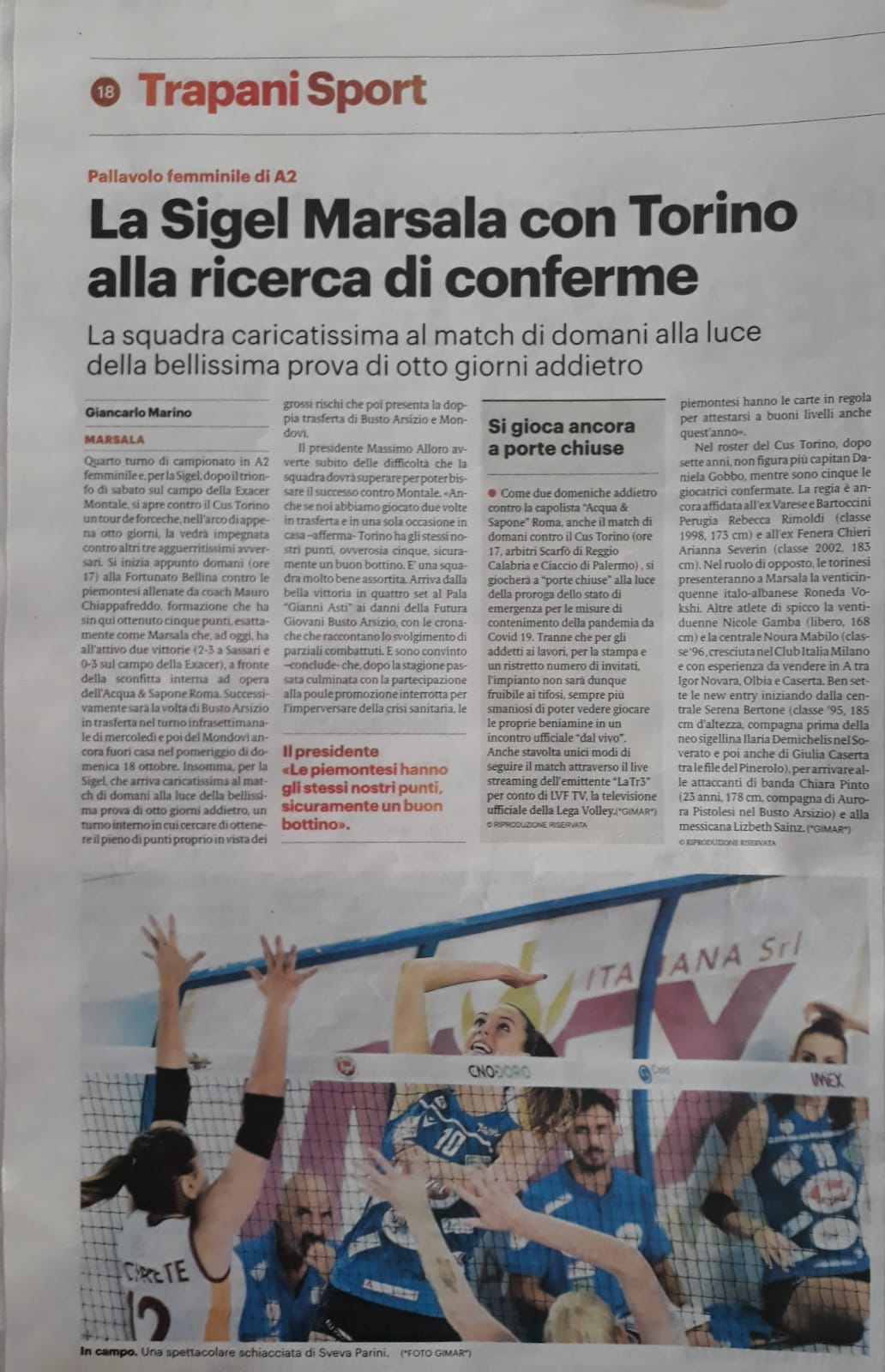 Il quotidiano online “LiveSicilia”, tra i primi in Sicilia per numero di pagine visitate e articoli letti, tratta di Sigel Marsala, concentrando l’oggetto del discorso sulle prossime date che aspettano le azzurre inserite nel girone “Ovest” di A2 e la situazione delle partite di campionato del girone di andata da recuperare a data da destinarsi dalla […]