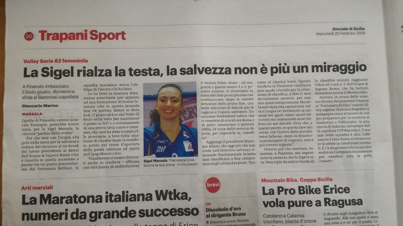 Il Giornale di Sicilia oggi torna a dedicarci un pezzo, con all’interno le dichiarazioni dell’allenatore Aiuto e del presidente Alloro che commentano il recente successo su Pinerolo. Buona lettura.