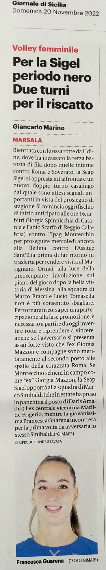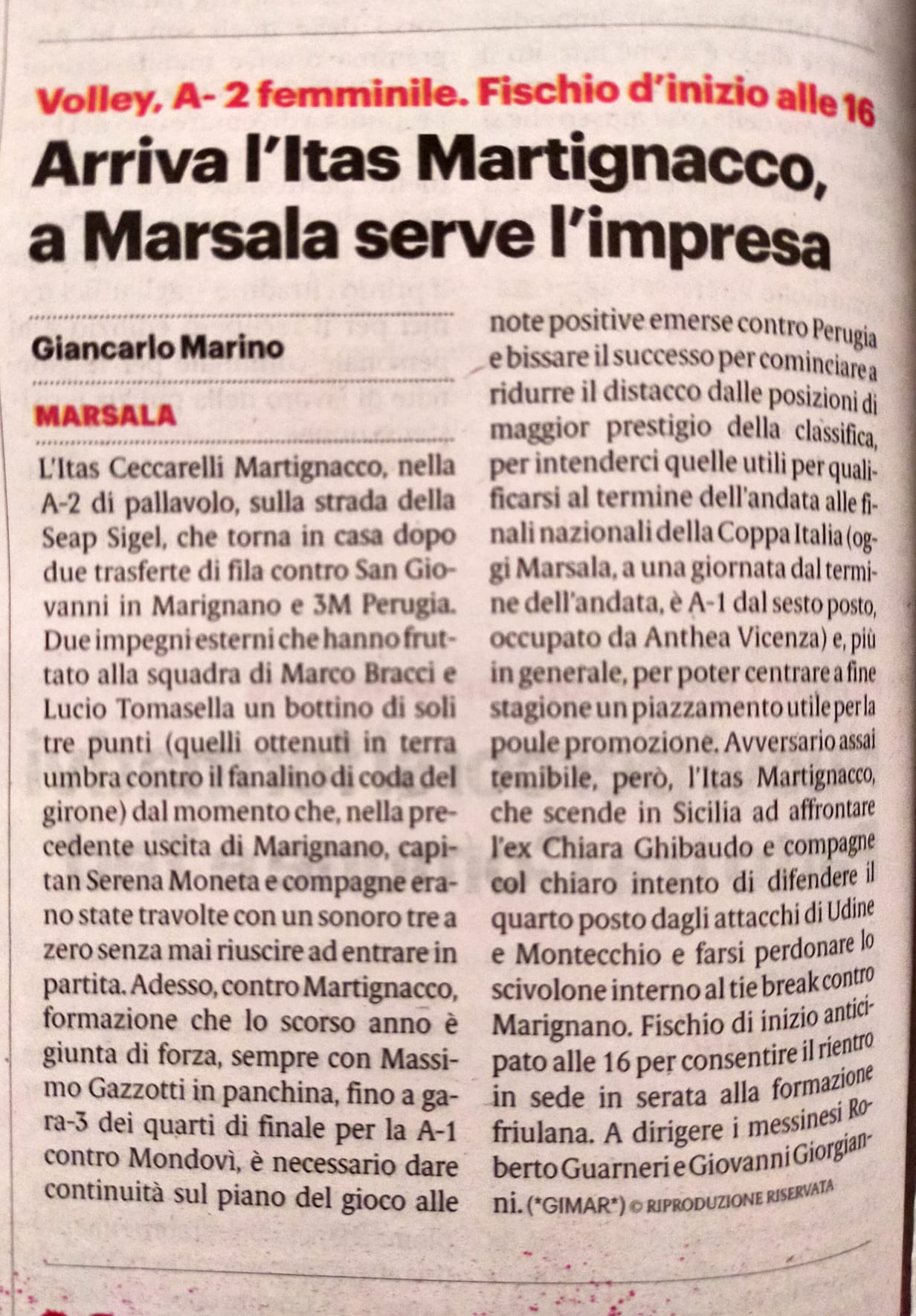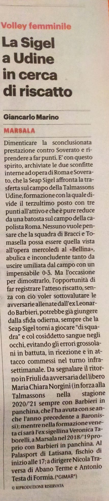 Articolo pregara inerente la gara contro la quinta forza del girone “B” Itas Ceccarelli Martignacco sulle colonne del “GdS”. Il quotidiano, attraverso la firma di Giancarlo Marino, presenta l’ultima fatica casalinga del 2022 della squadra di Marco Bracci. Alla palestra “Fortunato Bellina” il via, eccezionalmente, alle ore 16.00. Buona lettura.